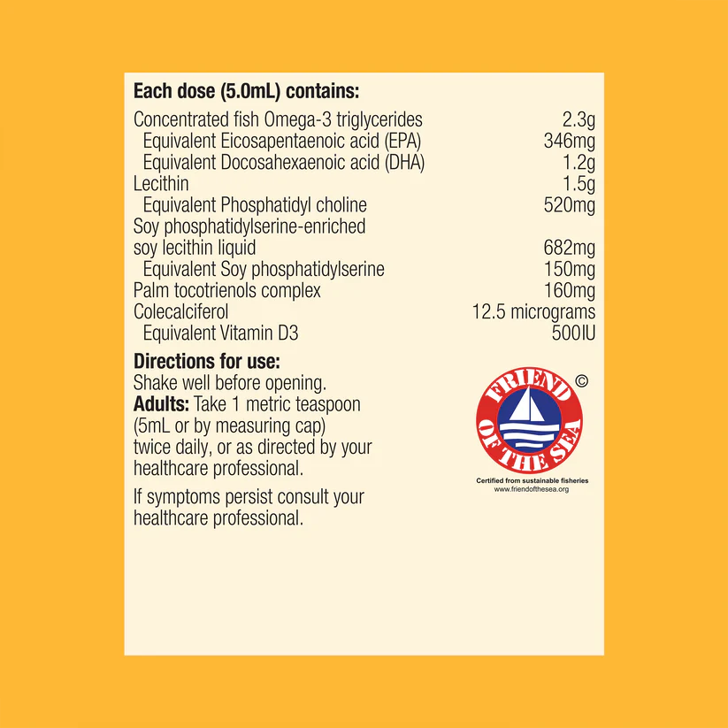 Omega Brain Plus contains purified fish oils from wild, ocean fresh, cold water fish. The omega-3 triglycerides in Omega Brain Plus are sourced from small, cold water fish using eco-fishing practices. The fish oil in Omega Brain Plus undergoes strict quality testing for pesticides and heavy metals such as lead, mercury and arsenic, to produce a high quality, stable fish oil product, in a delicious peppermint flavour for reduced fishy aftertaste.